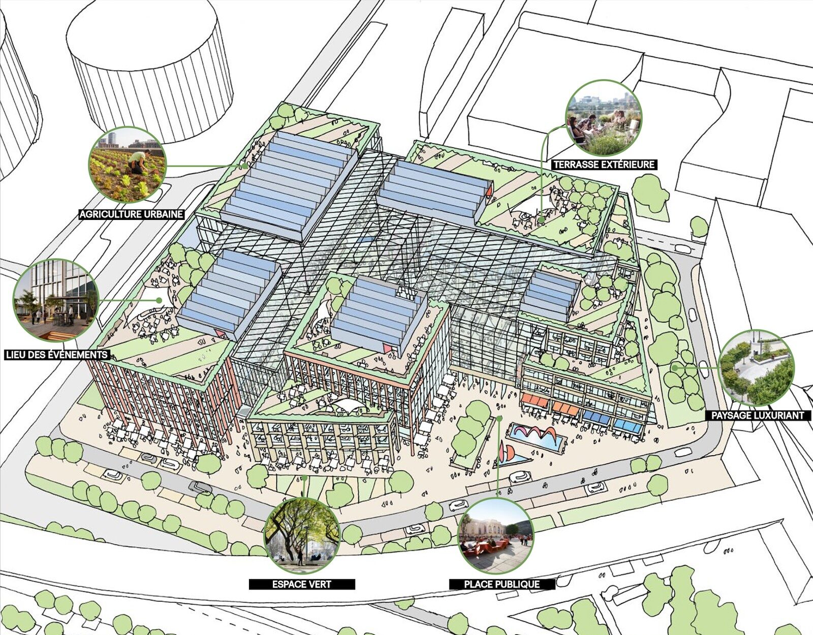 Constellation regroupe en effet trois immeubles associant laboratoires de recherche et bureaux, répartis en plusieurs points du plateau de Saclay. Ces entités de différentes tailles ont été pensées à la fois pour accueillir différents formats d’entreprises, pour accueillir le parcours résidentiel des start up, avec des espaces adaptés à leurs différentes phases de développement, et pour proposer des services connexes partagés, répartis entre les trois sites entre lesquels se déplacent au quotidien les utilisateurs.